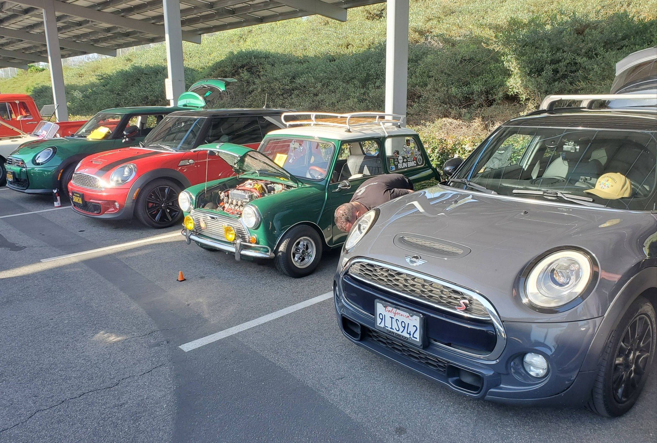 The annual Motors4Music Car show. SD Minis was represented by Jamie, Joe, Jane, John, and Brock. We enjoyed the day talking with other car enthusiasts. It was a big turn out to support the San Marcos High School Knight Regiment marching band!